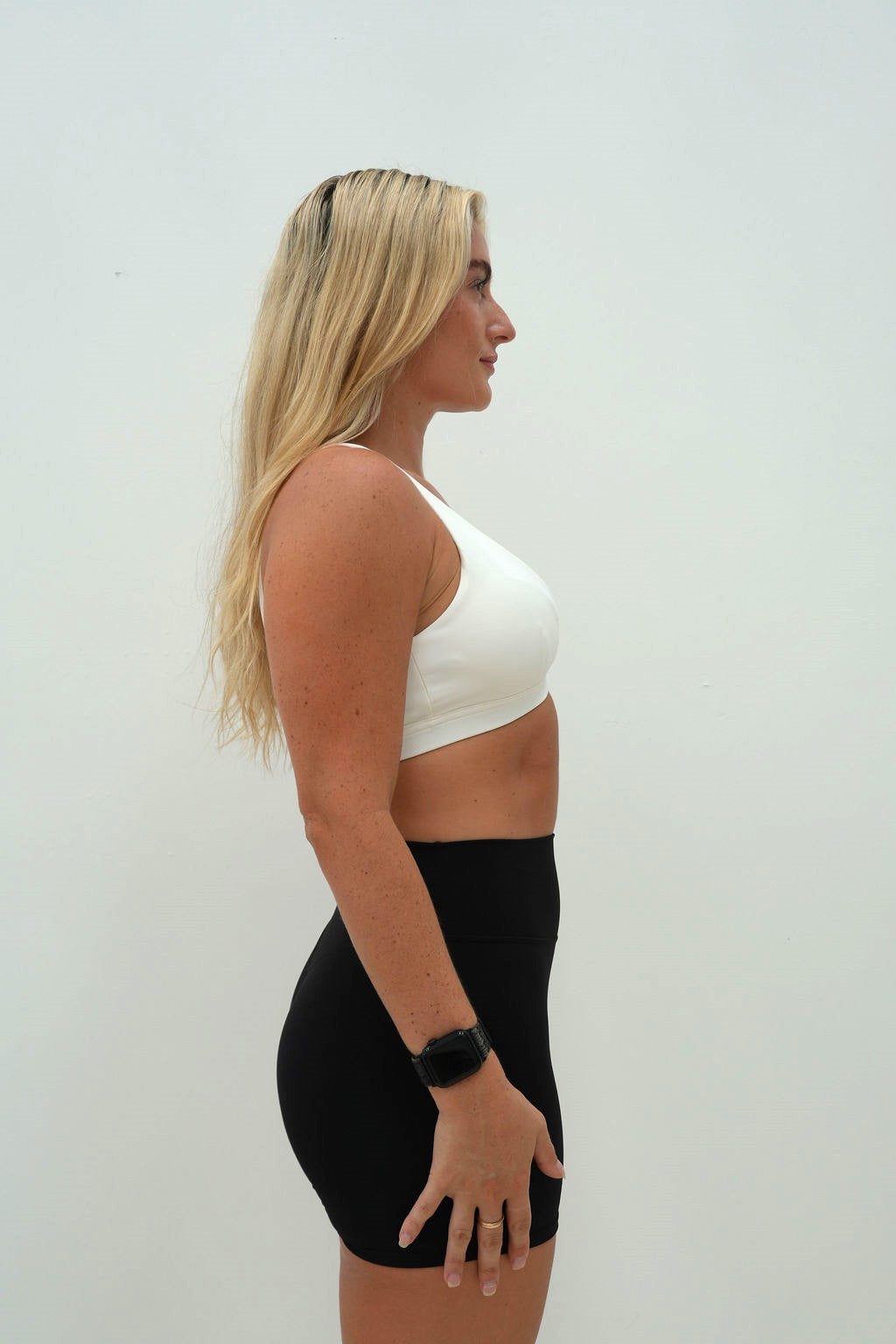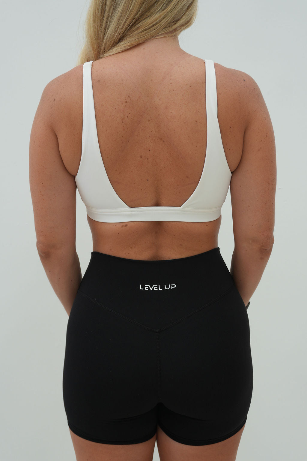 A flattering V neckline creates a clean, feminine shape through the front, balanced by a softly structured underband that provides gentle support without compromising on comfort. The back features a minimal, open scoop design that highlights the shoulders and back with a modern, elevated finish.